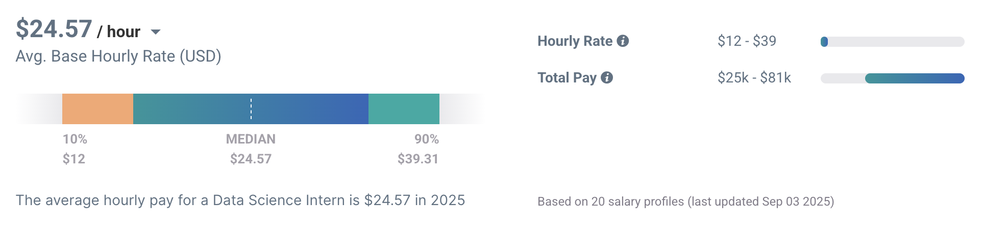 According to PayScale, the compensation for a data science intern ranged from $12 to $39 an hour in the United States.