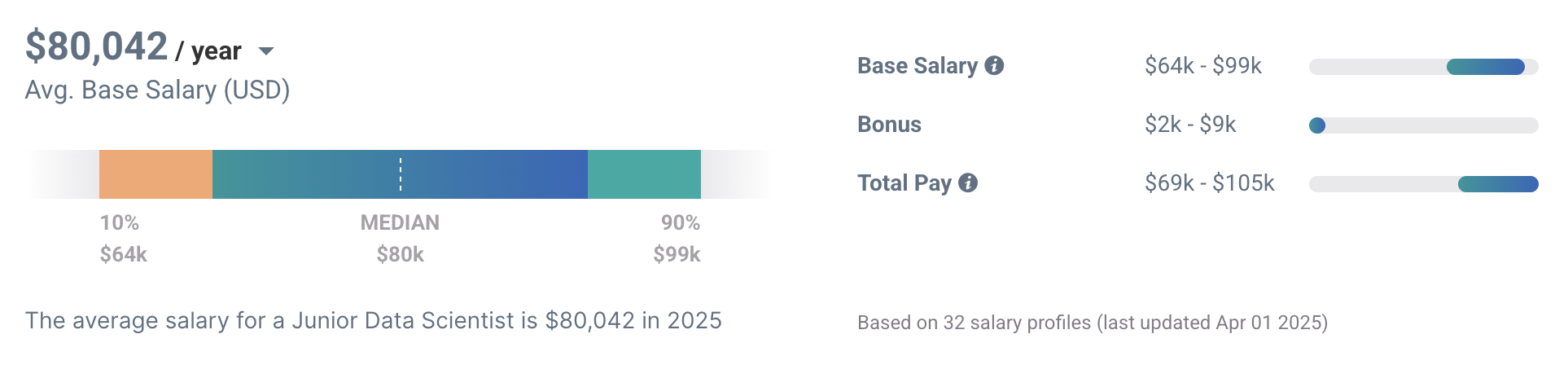 According to PayScale, the base salary range for a junior data scientist ranges from $64,000 to $99,000 in the United States.