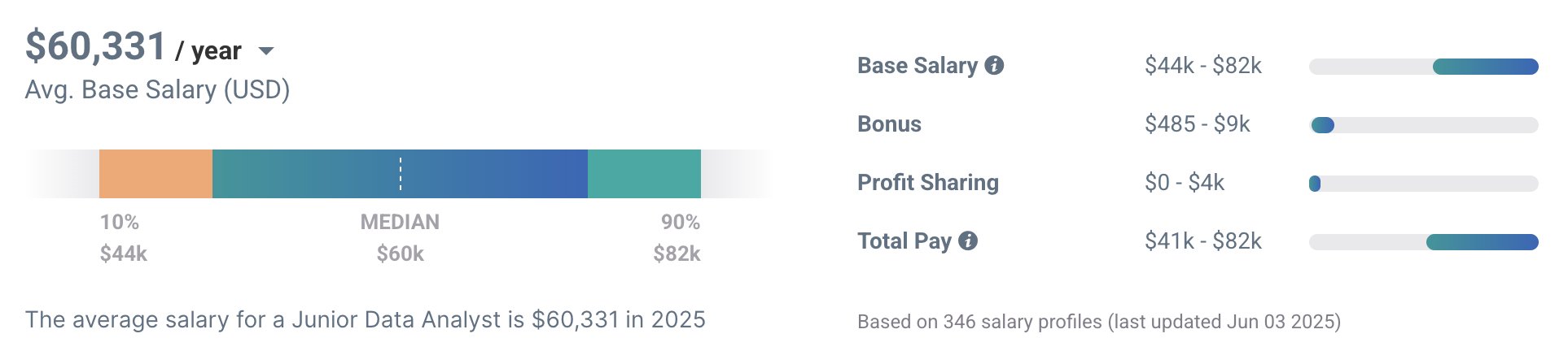 According to PayScale, the pay range for a junior data analyst in the United States can range between $44,000 and $82,000.